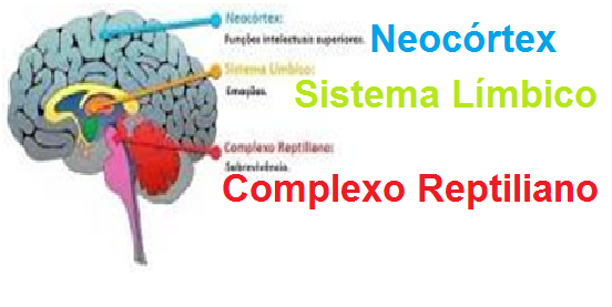 Do mesmo modo nosso cérebro é formado por 3 partes; o Reptiliano, onde fica nosso subconsciente; o Límbico, que processa nossas emoções e Neocórtex, que trabalha com a inteligência e informações que chegam até nós.